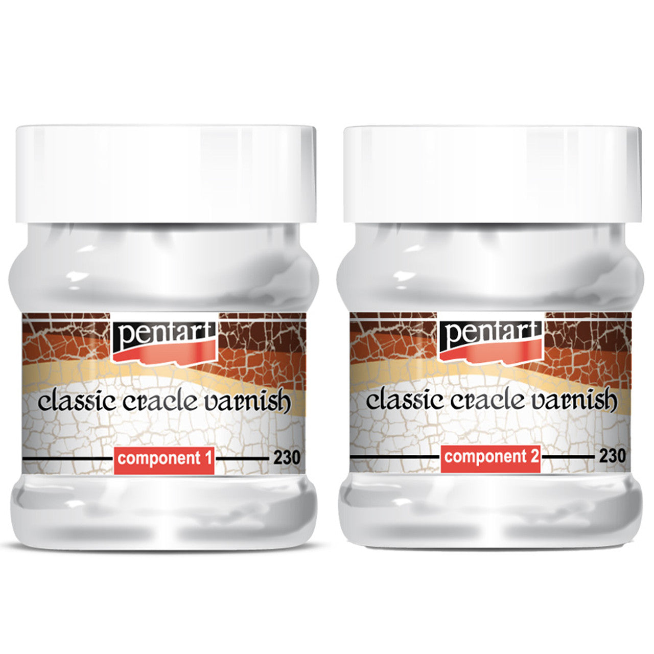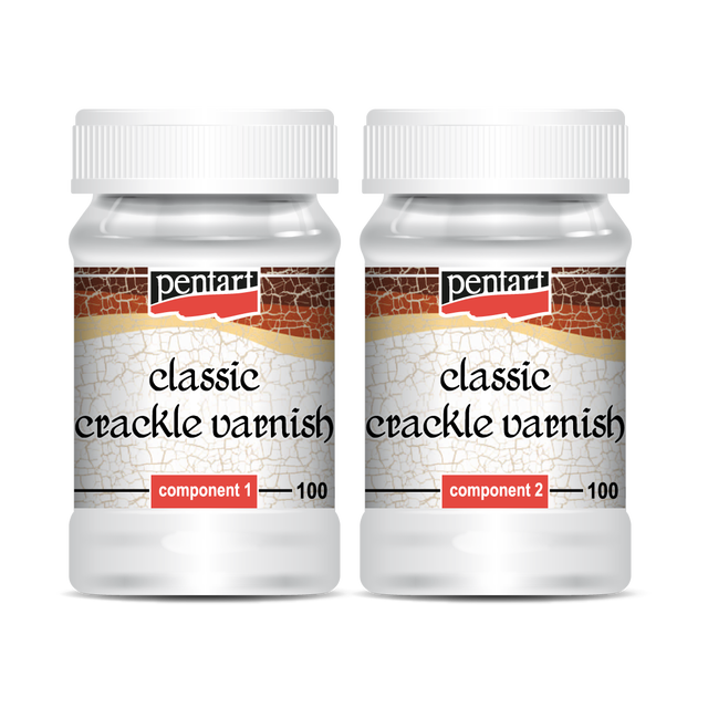 Water-based, two component crackle varnish to create antique, cracked surfaces. Apply component 1 in an even layer and let it dry completely. Then spread component 2. The depth and the network of the cracks depends on the thickness of the layer and on the technique of the application. The layer will dry transparent and waterproof. Highlight the cracks with Antique Paste or Liquid Patina.
