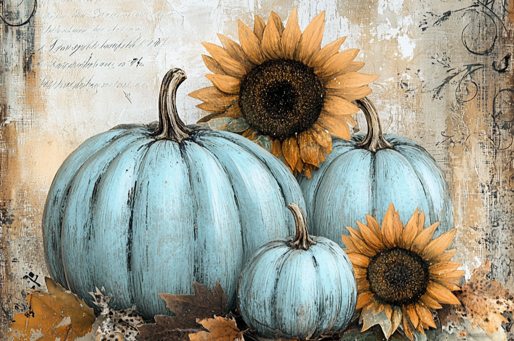 Meet Country Chic Harvest, where farmhouse charm and autumn elegance go together like pumpkins and spice. This trio of dreamy blue pumpkins is surrounded by golden sunflowers and crisp fall leaves, all set against a lightly distressed vintage script background.