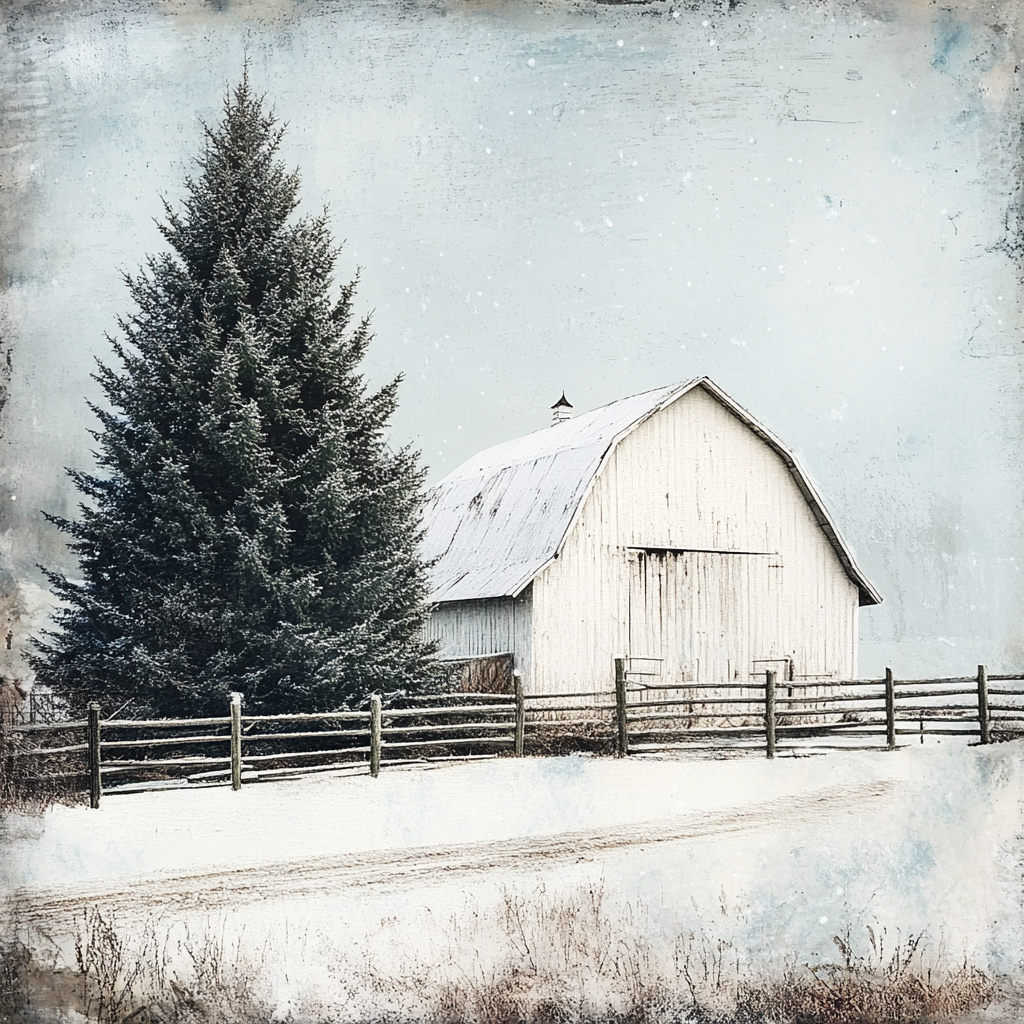 This tissue paper showcases a striking snow-dusted evergreen standing beside a weathered white barn, enveloped by a peaceful blanket of snow. A rustic wooden fence lines the snowy path, adding a touch of countryside charm to this tranquil scene. The soft, wintry palette and gently falling snowflakes create a peaceful, reflective atmosphere that captures the beauty of rural life during the winter season.