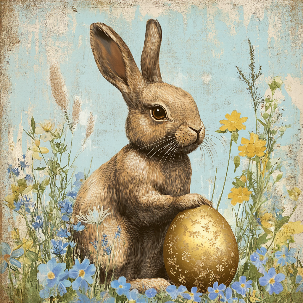 This image portrays a whimsical and serene scene featuring a beautifully illustrated rabbit holding a golden egg adorned with intricate floral patterns. The rabbit is surrounded by a lush arrangement of wildflowers in vibrant yellows and soft blues, set against a textured, weathered blue background that evokes a vintage charm. The delicate artistry and pastoral feel make it ideal for spring or Easter-themed decor, greeting cards, or craft projects. The design radiates warmth, nostalgia, and elegance, appealing to those who enjoy rustic or nature-inspired artwork with a touch of fantasy.
