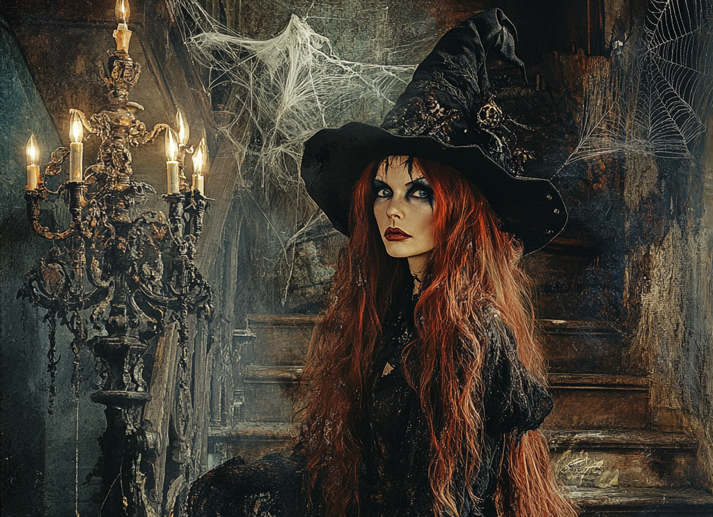 Step into a world where shadows whisper secrets and every stair creaks with history. Mistress of the Manor captures a spellbinding sorceress with piercing eyes and fiery locks, surrounded by cobwebs, candlelight, and the grandeur of a long-forgotten estate. Her presence is hauntingly beautiful—elegance draped in mystery.