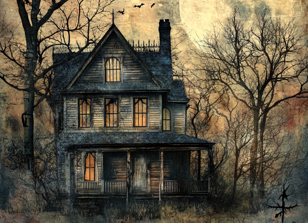 Step into the shadows of Moonlit Manor, where mystery drips from the eaves and the full moon casts its glow on tales untold. This eerie Victorian house is surrounded by skeletal trees and watched over by a misty golden sky. Faint lights glow from within... but no one ever sees who lights them.