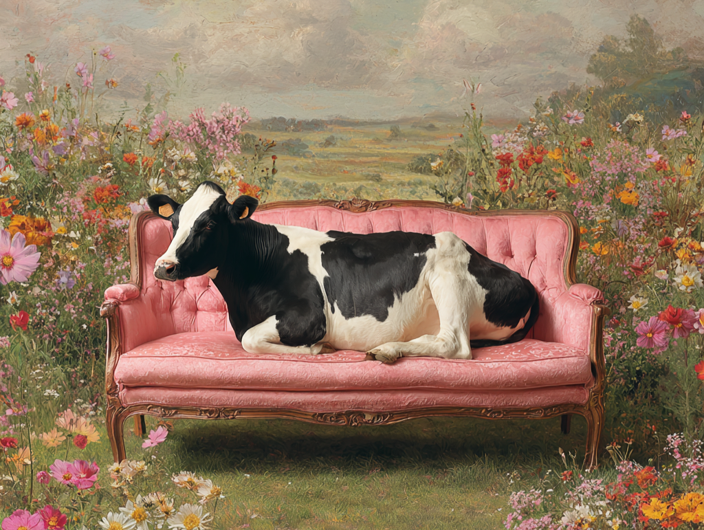 Farmhouse meets fabulous in this whimsical design featuring a stately cow reclining on a vintage pink sofa, surrounded by blooming wildflowers and rolling countryside skies. Equal parts rustic and playful, this design adds a dash of humor and charm to any project.