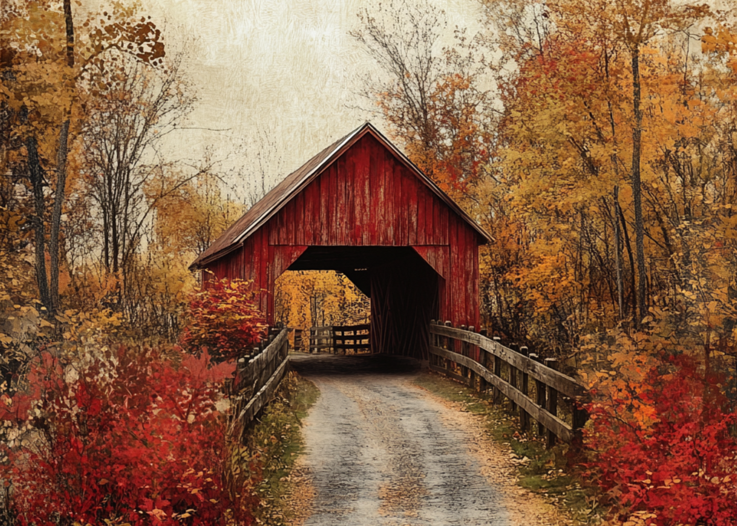 Step back in time with this nostalgic fall design featuring a rustic red covered bridge framed by a glowing forest of autumn foliage. The golden yellows, burnt oranges, and fiery reds capture the magic of harvest season, while the weathered, painterly finish adds a vintage touch.