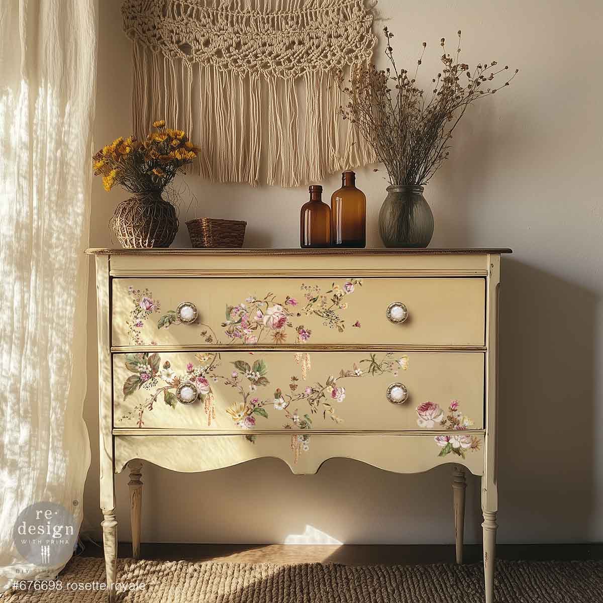 This transfer works beautifully on drawer fronts, trays, and accent pieces—perfect for romantic, French-inspired DIYs or garden-style home décor. HOW TO USE: Apply the Rosette Royale Middy Transfer by peeling, placing, and rubbing it on your chosen surface—wood, glass, or metal. Finish with a sealer for lasting beauty.