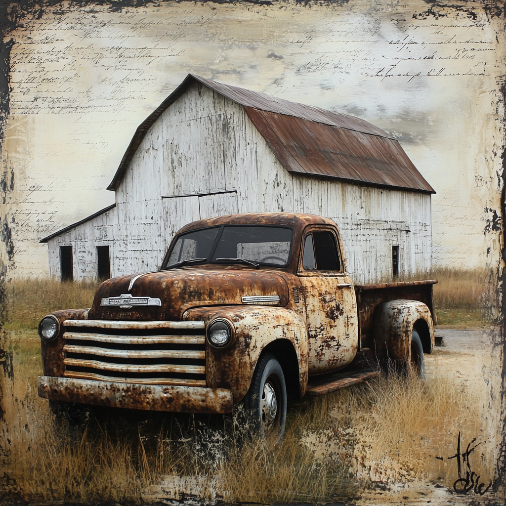 Step into the gentle hush of an old farmstead as autumn settles in. Rusty Harvest features a timeworn pickup truck—its once–bright orange paint now mottled with warm russet patina—parked in front of a weathered white barn with a faded tin roof. Tall, golden grasses sway in a lazy breeze, reaching toward the truck’s tires as if to claim it. Behind it all, the sky wears soft cream and gray brushstrokes, lightly tinged with the ghosts of summer’s warmth and framed by tendrils of vintage script.