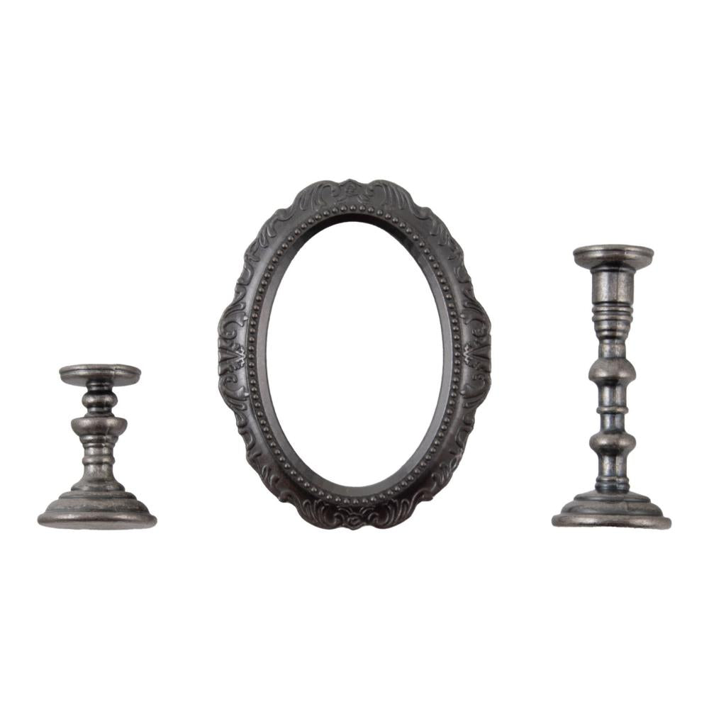 You could say they are made for each other. The perfect little metal candlestick meets the Tim Holtz Drippy Candle (sold separately). Add the antique oval frame to create the most creative creepy scene in a Display Dome, Curio Clock or Vignette Box. Perfect for Halloween decor, Vignette boxes, or any other 3D art project that needs a touch of gothic illumination. This package contains 1 oval frame, 2 candle stands (1 large, 1 small), Drippy candles sold separately. Constructed of metal with antique nickel finish. Oval frame measures 2-1/4 inches in height and 1-3/4 inches in width, small candlesticks measure 1 inch in height and large measures 1-3/4 inches in height.