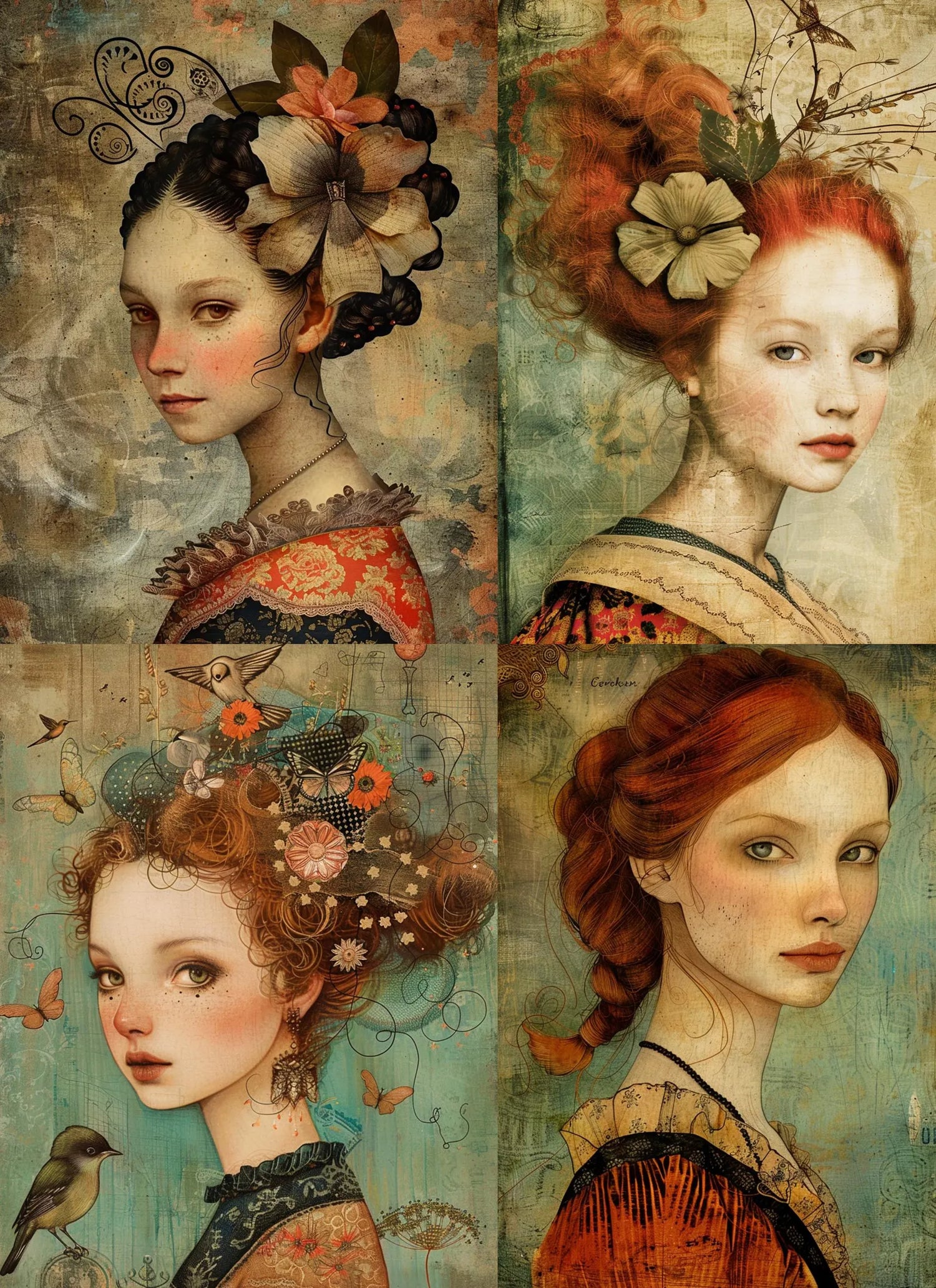 The bottom left depicts a youthful figure with a whimsical arrangement of flowers, butterflies, and birds intertwined in her hair, exuding a sense of dreamlike wonder.